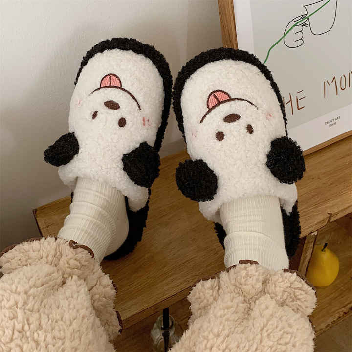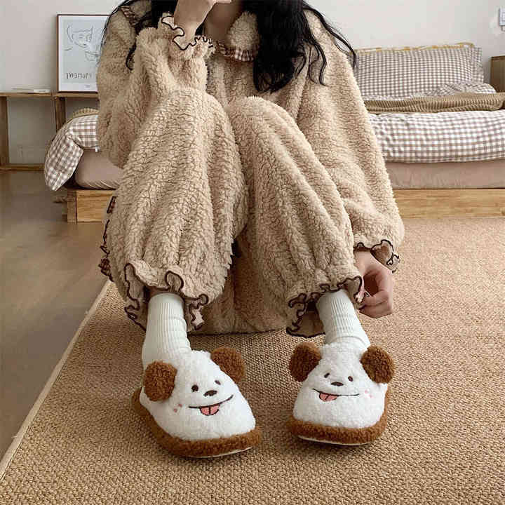 Pantoufles d'hiver en fourrure pour femmes, chaussures chaudes en coton, joli chien de dessin animé, chambre d'intérieur, diapositives en fourrure pour dames