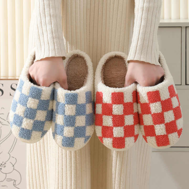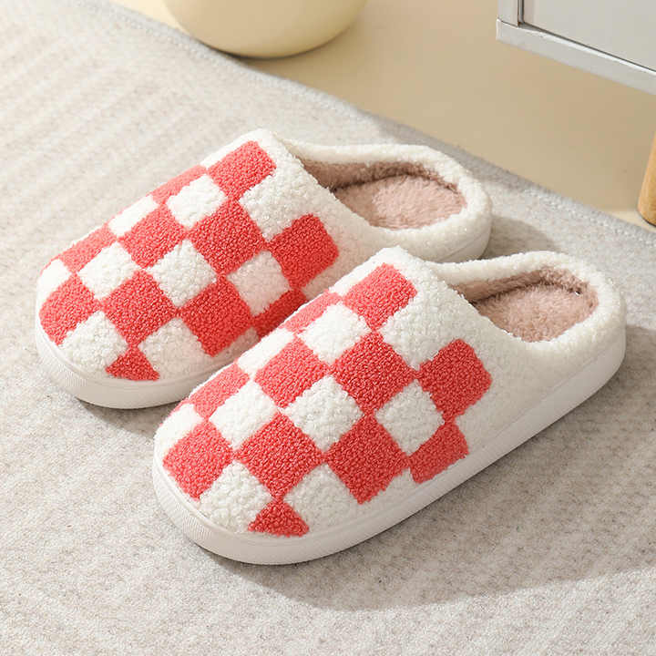 Pantoufles d'hiver en peluche à damier de dessin animé, chaussures d'intérieur en coton silencieuses, Ultra légères et antidérapantes