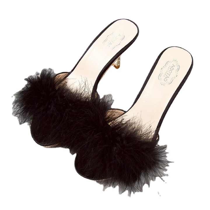 Sandales à talons aiguilles poilues pour femmes, nouvelle mode d'été, mot glisser, bout ouvert, pantoufles à talons hauts