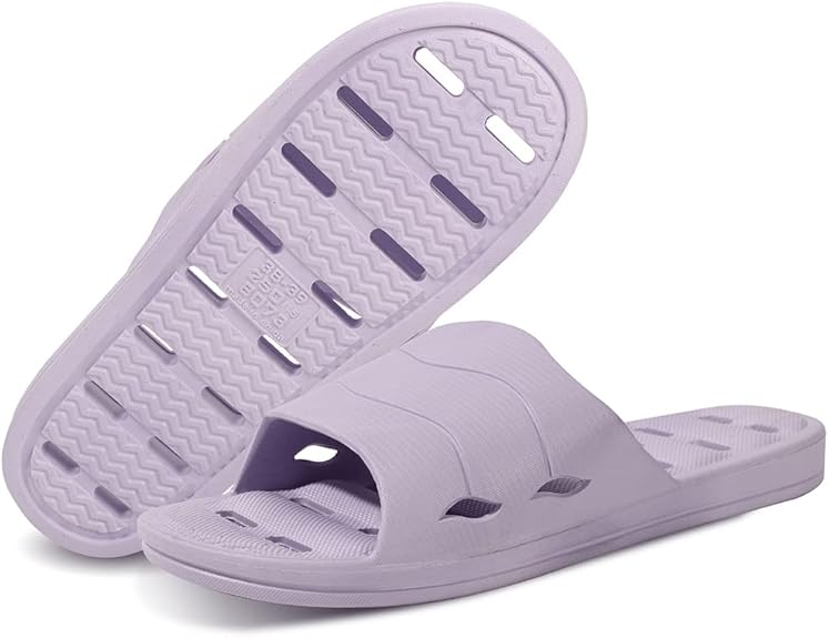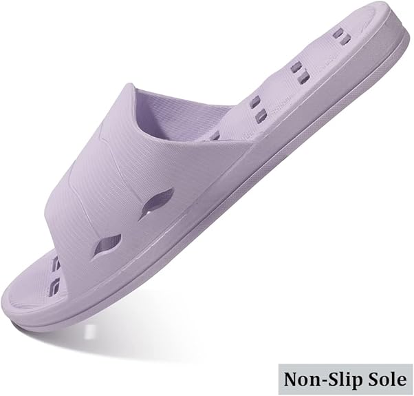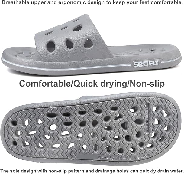 Conception de mise à niveau: Chaussures de douche en matériau EVA très élastique et amélioré, qui ne vous frottera pas les pieds en marche et la semelle douce offre un amortiment, ils rendront vos pieds à l'aise et réduiront la fatigue. Le haut et la semelle sont tous deux conçus avec des trous de drainage pour le séchage rapide et la respirabilité, qui peuvent rapidement garder les pieds secs après la douche